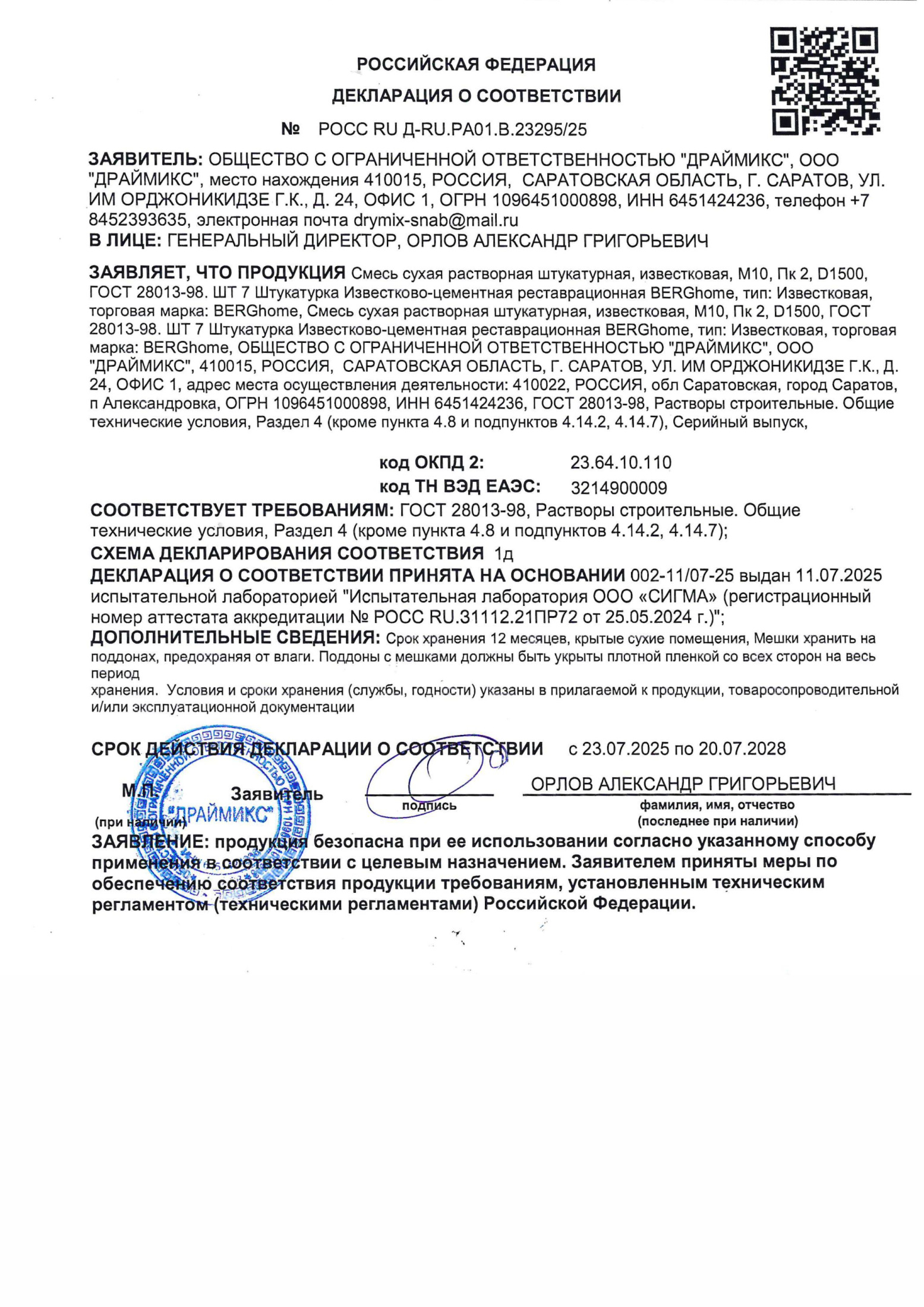 Смесь сухая растворная штукатурная, известковая, класс прочности М10, Пк2, D1500. ГОСТ 28013-98.